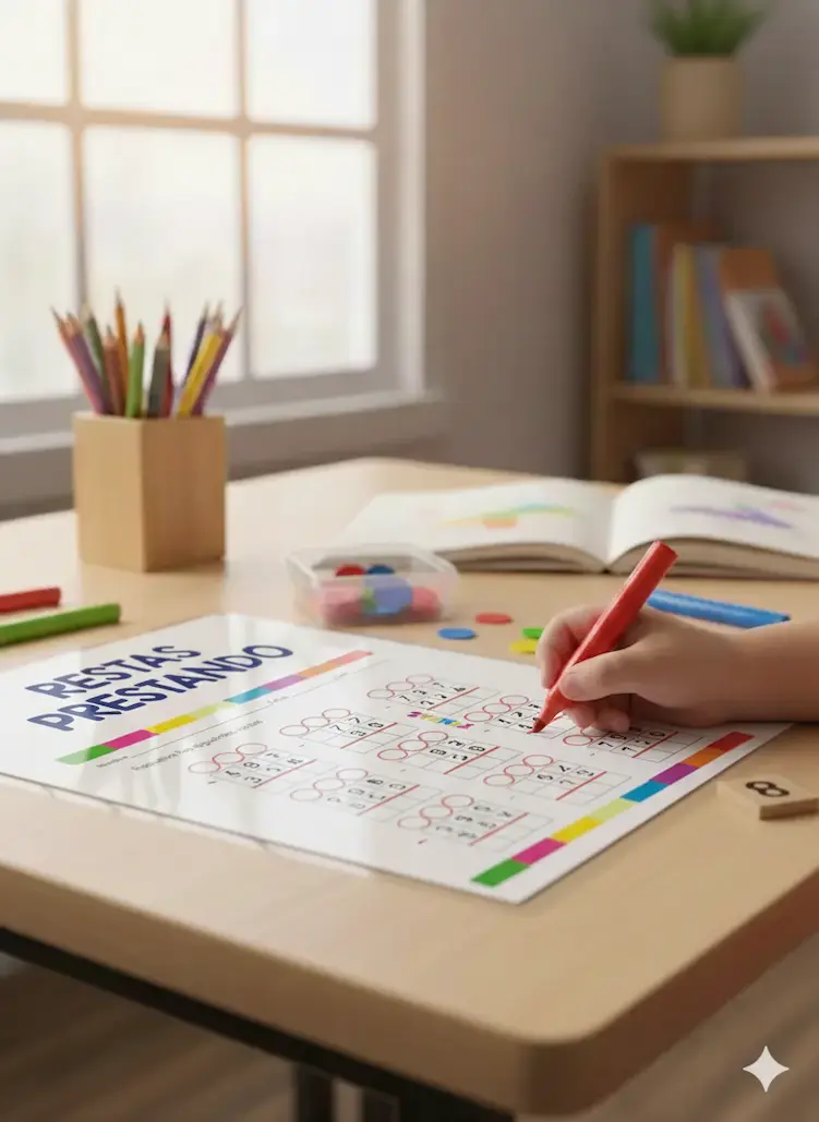 Las restas prestando son operaciones donde el número del sustraendo (el de abajo) es mayor que el del minuendo (el de arriba) en una columna específica (unidades, decenas o centenas). Para resolverlo, el niño debe «pedir prestada» una unidad al valor posicional siguiente.